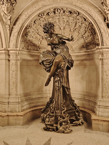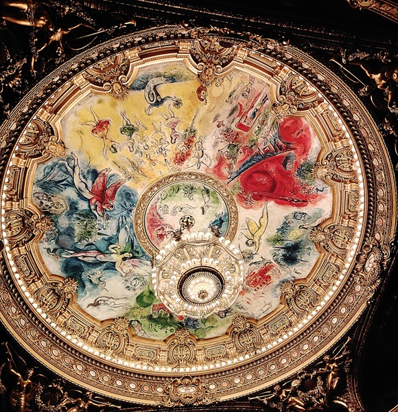 Notre guide démarre la visite par un exposé retraçant les 150 ans du palais Garnier. Le début de la visite nous emmène découvrir la Pythie réalisée par Marcello. Ce pseudo cache en réalité une Sculptrice. Ensuite, direction les salles du Palais en passant par le Grand Escalier monumental qui nous amène à la rotonde des abonnés. Ce lieu avait un rôle mondain; il était fréquenté par l’élite parisienne » il fallait se faire voir » La visite se termine par la Grande Salle rouge et or, avec son immense lustre. En 1964 Marc Chagall réalise un nouveau plafond en rendant hommage à de grands compositeurs.